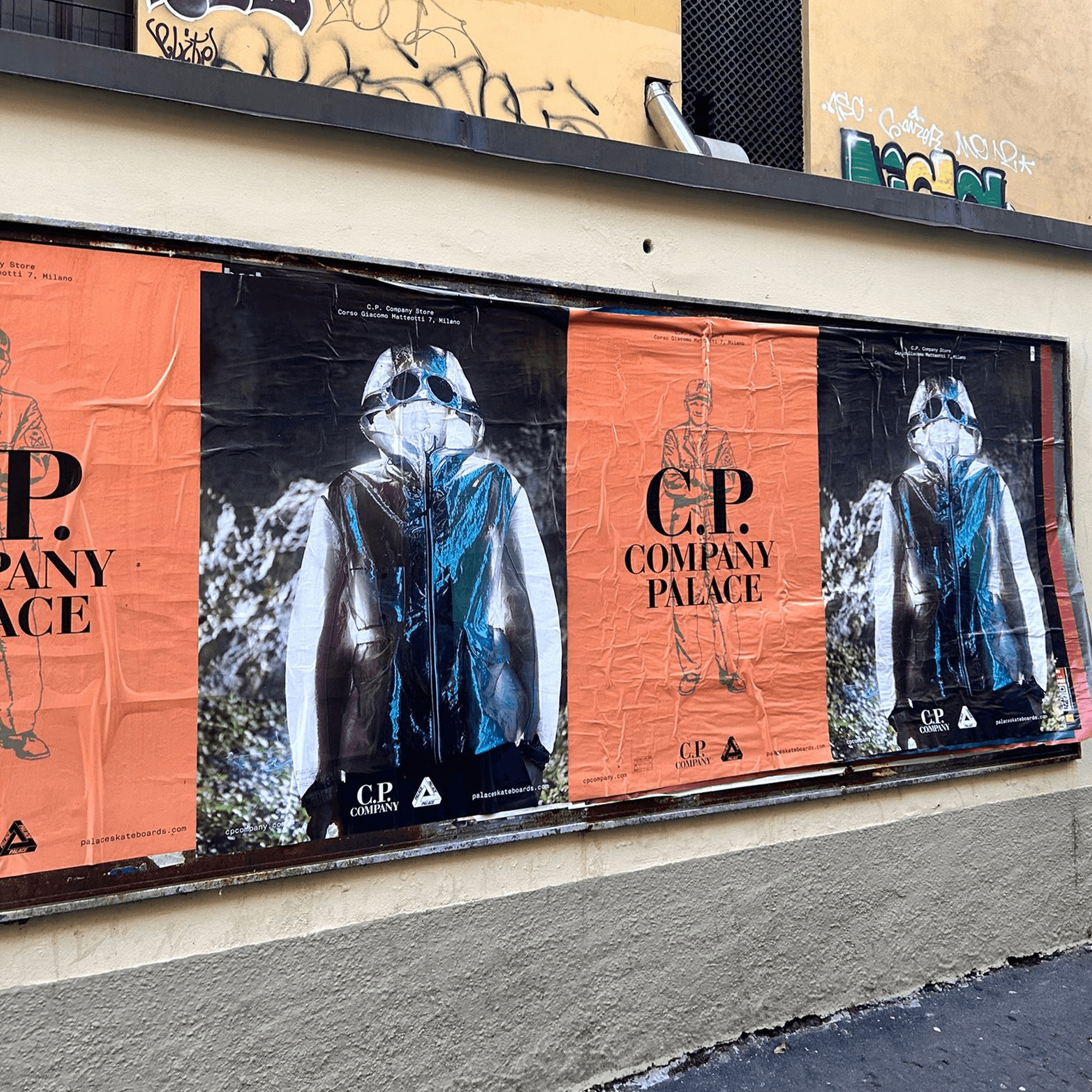 Print and digital communication for the second Palace x C.P. Company collaboration, Holiday 2023. Flyposting campaign distributed as out-of-home advertising across London, Milan and Seoul. December 2023.